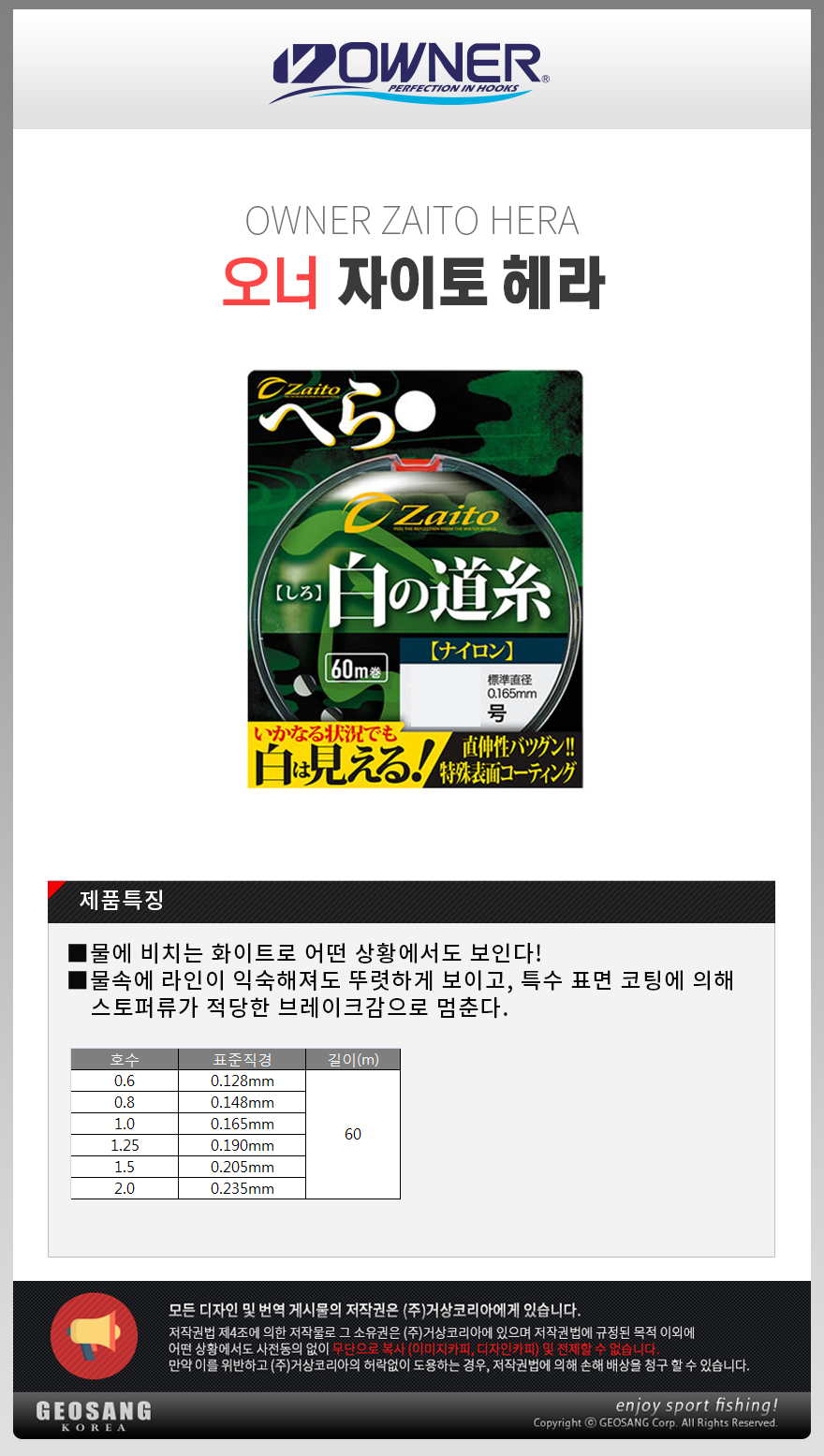 오너 자이토 헤라 원줄 화이트 60m 민물 붕어 낚시줄