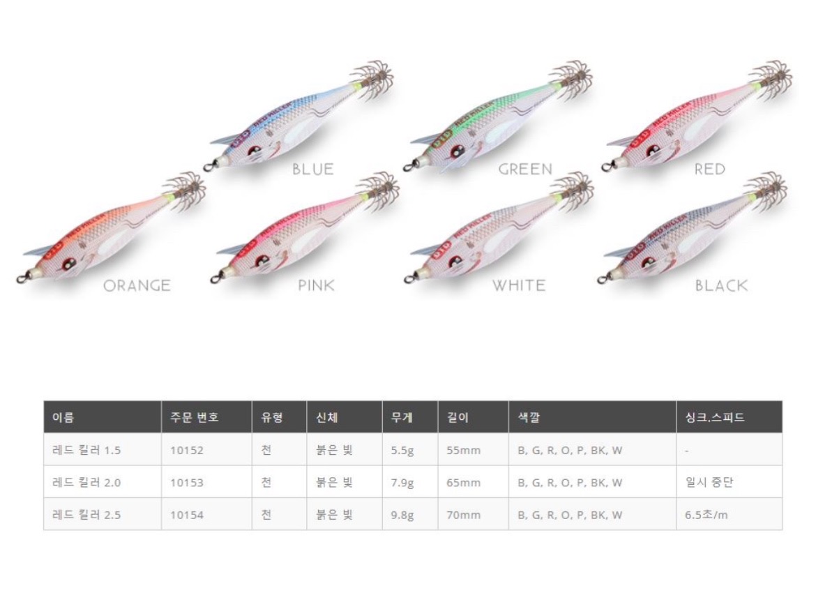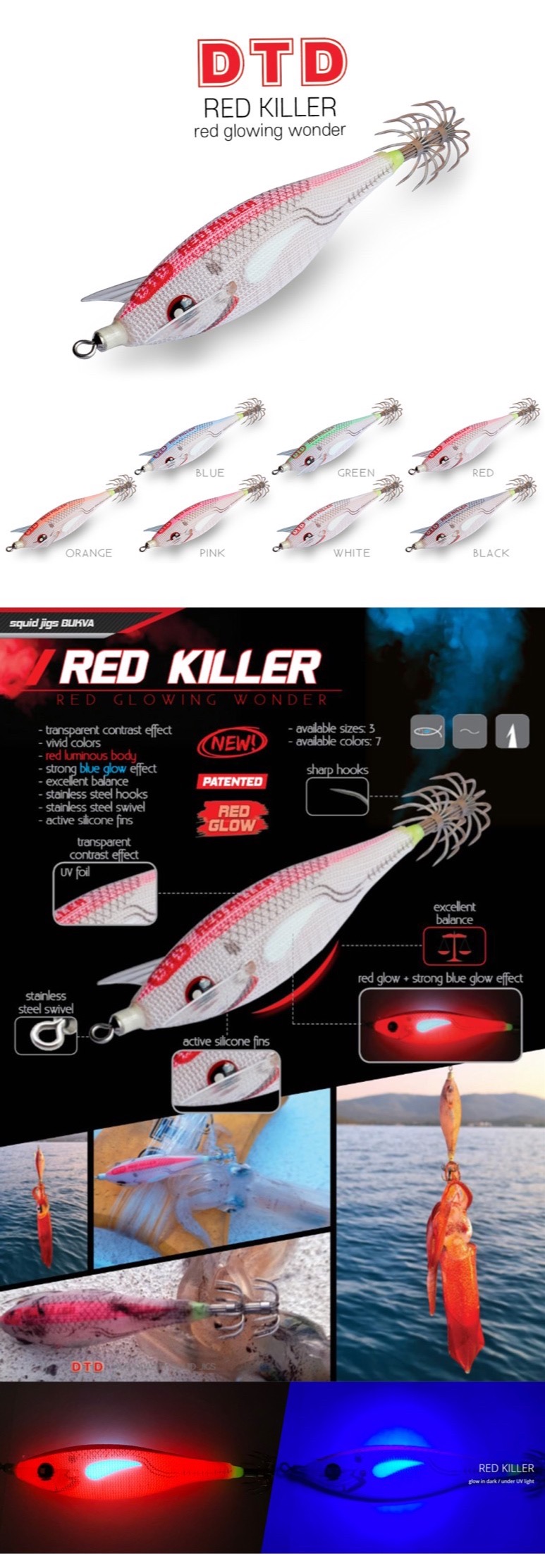 레드킬러는 배에서 오징어를 잡기위한 새로운 오징어 지그로 화이트 킬러 부크바와 유사하지만 몸체가 붉게 빛납니다.